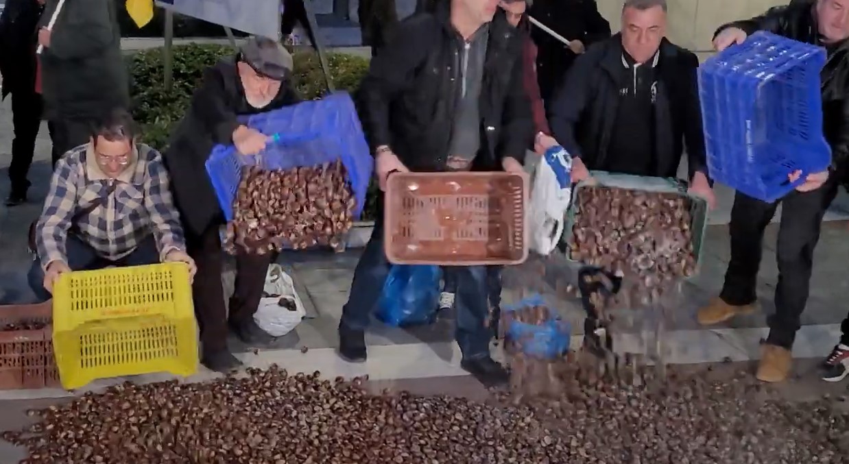 Οι καστανοπαραγωγοί σε ένδειξη διαμαρτυρίας σκόρπισαν κάστανα, μπροστά από την έδρα της Περιφέρειας Θεσσαλίας.