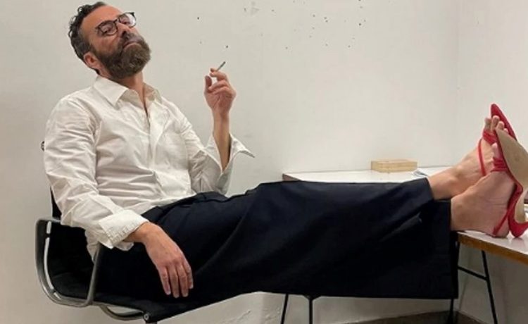 Η Κόρα Καρβούνη επέλεξε για το event ένα total red look. Τα ψηλοτάκουνά της έδωσαν έμπνευση στον Άγγελο Μπράτη για μία φωτογραφία. Ο σχεδιαστής πόζαρε χαλαρός φορώντας τα και αναδεικνύοντάς τα τοποθετώντας τα πόδια του πάνω στο γραφείο που βρισκόταν μπροστά του.