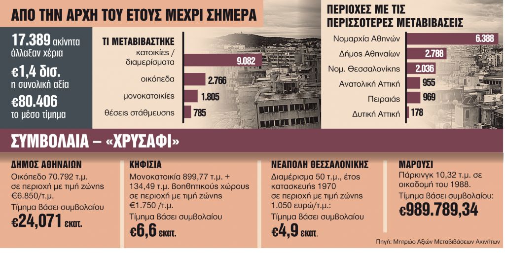 Περισσότερα από 17.000 ακίνητα έχουν αλλάξει χέρια από την αρχή του έτους με τη συνολική αξία τους να αγγίζει το 1,4 δισ. ευρώ όπως αποκαλύπτεται από τα συμβόλαια αγοραπωλησιών ακινήτων. Τα στοιχεία του Μητρώου Αξιών Μεταβιβάσεων Ακινήτων που επεξεργάστηκαν «ΤΑ ΝΕΑ» δείχνουν τον χορό εκατομμυρίων που έχει στηθεί στην ελληνική κτηματαγορά, την όρεξη Ελλήνων και ξένων για επενδύσεις σε ακίνητα αλλά και το άλμα που καταγράφουν οι εμπορικές τιμές.