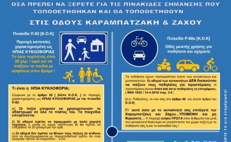 “Ζητήματα σεβασμού της προσβασιμότητας σε όλους τους δημόσιους χώρους, των διαβάσεων και η έλλειψη παραχώρησης προτεραιότητας στους πεζούς από τους οδηγούς αυτοκινήτων, το ποδήλατο και η ασφαλή μετακίνηση των ποδηλατιστών στην πόλη, οι υψηλές ταχύτητες που αναπτύσσονται εντός του αστικού ιστού, ήπια κυκλοφορία και απαιτήσεις για την εφαρμογή της, διαμόρφωση κυκλοφοριακής συνείδησης κ.α. ήταν ορισμένα από τα θέματα που συζητήθηκαν. Υπήρξε ενημέρωση των εκπροσώπων της τροχαίας για την κυκλοφοριακή κατάσταση στις οδούς Ζάχου και Καραμπατζάκη. Κατατέθηκε υπόμνημα – αναφορά για το πώς αυτή έχει εξελιχθεί – μεταλλαχθεί από «Ηπια κυκλοφορία» σε αρτηρία με ταχύτητες πολύ υψηλές με αποτέλεσμα την επικινδυνότητα για την ασφάλεια ανθρώπων και ζώων, αλλά κυρίως ότι στην περιοχή πλέον δεν υφίστανται στοιχεία ήπιας κυκλοφορίας. Τονίστηκαν τα όσα απαιτούνται για να φέρει μια περιοχή τον τίτλο ως ήπια κυκλοφορία και την σχετική πινακίδα Π-92 του Κ.Ο.Κ η έχει τοποθετηθεί στην περιοχή.