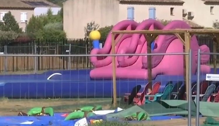 Χθες στο απόγευμα μία φουσκωτή κατασκευή ύψους 20 μέτρων στο Wonderland Waterpark, στην τουριστική πόλη Σεν-Μαξιμέν-λα-Σεντ-Μπομ, παρασύρθηκε από τον αέρα κάνοντας άλμα ύψους 50 μέτρων με δύο ανθρώπους στο εσωτερικό της, εξήγησαν οι πυροσβέστες.