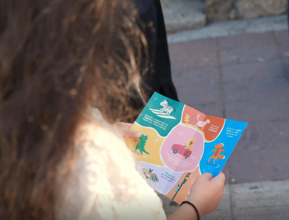 Μια μικρή μαθήτρια κρατά στα χέρια της το ειδικό φυλλάδιο με οδηγίες οδικής ασφάλειας
