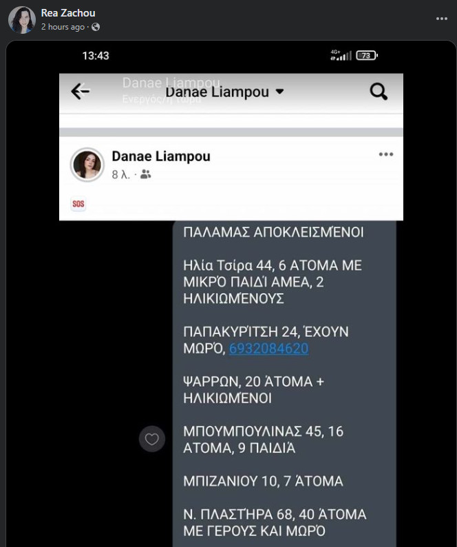 Στις αναρτήσεις κάνουν λόγο για ηλικιωμένους και μωρά που χρειάζονται βοήθεια, ενώ σε άλλες αναρτήσεις γίνεται λόγο για νεφροπαθείς και εγκλωβισμένους σε ταράτσες.