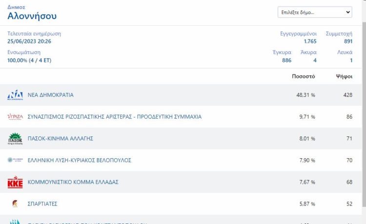 Ολοκληρώθηκε η καταμέτρηση στην Αλόννησο και η ΝΔ έχει πετύχει μια σαρωτική νίκη με 48,31%, ενώ ο ΣΥΡΙΖΑ έλαβε 9,71% και το ΠΑΣΟΚ τρίτο κόμμα με 8.01%