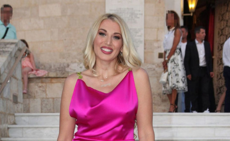 Εκεί, η παρουσιάστρια έλαμπε στο χρυσό φόρεμα, δημιουργία της Celia Kritharioti, έχοντας διαρκώς στο πλευρό της τον σύζυγό της αλλά και τις δύο νονές, Σούλα Λιάκου και Αλεξάνδρα Σταθοκωστοπούλου, (αδελφή του Βασίλη Σταθοκωστόπουλου).