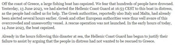 «Χθες, 13 Ιουνίου 2023, είχαμε ειδοποιήσει το Ελληνικό Λιμενικό Σώμα στις 16:53 CEST για αυτό το σκάφος σε κίνδυνο, καθώς ο κόσμος μας είχε καλέσει για βοήθεια. Οι ελληνικές αρχές, σύμφωνα με πληροφορίες και η Ιταλία και η Μάλτα, είχαν ήδη ειδοποιηθεί αρκετές ώρες νωρίτερα. Οι ελληνικές και άλλες ευρωπαϊκές αρχές γνώριζαν λοιπόν πολύ καλά αυτό το υπερπλήρες και ακατάλληλο για πλωτό πλοίο. Δεν ξεκίνησε επιχείρηση διάσωσης. Τα ξημερώματα σήμερα, 14 Ιουνίου 2023, το σκάφος ανατράπηκε».