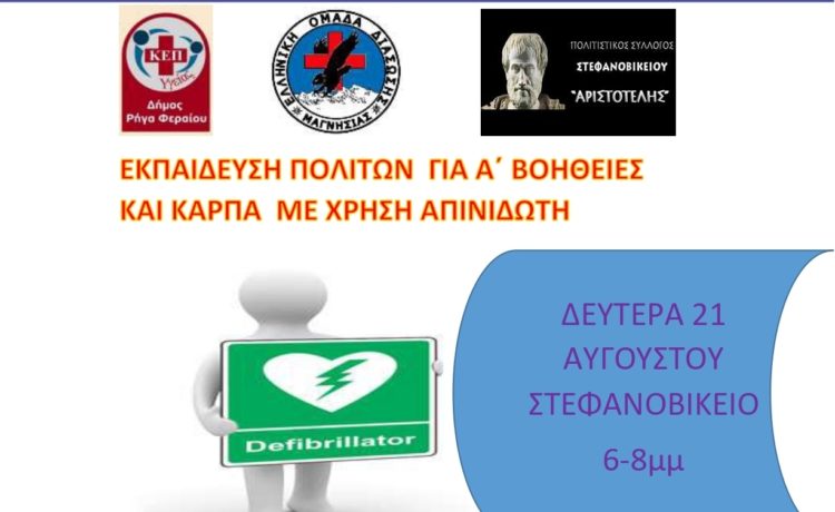 Με αφορμή την τοποθέτηση εξωτερικών απινιδωτών στον Δήμο Ρήγα Φεραίου, το ΚΕΠ Υγείας διοργανώνει εκπαίδευση καρδιοπνευμονικής αναζωογόνησης και χρήσης εξωτερικού απινιδωτή, με τον πολιτιστικό Σύλλογο Στεφανοβικείου και την Ελληνική Ομάδα Διάσωσης, την Δευτέρα 21 Αυγούστου 2023 και ώρες 6 – 8μμ στην Κοινότητα Στεφανοβικείου.