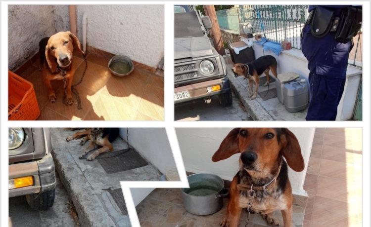Μία τέτοια κατάσταση συνάντησαν εθελοντές της ομάδας μας με 2 σκυλάκια, Ελληνικά κυνηγόσκυλα, νεαρά σε ηλικία, (αρσενικό και θηλυκό) να βιώνουν παθητική κακοποίηση (μόνιμη αλυσόδεση) -το ένα (αρσενικό), στο πεζοδρόμιο με “κατάλυμα” για προστασία από τις καιρικές συνθήκες κάτω από το σταθμευμένο αυτοκίνητο, το άλλο (θηλυκό) μέσα στην αυλή, στο σπίτι του ηλικιωμένου, (πρώην κυνηγού), όπου για σπιτάκι είχε ένα τελάρο από φρούτα και δίχως σκεπαστρο.