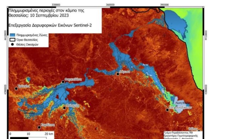 Δεδομένα του πολυφασματικού δορυφόρου Sentinel-2 χρησιμοποιήθηκαν για τη χαρτογράφηση των πλημμυρισμένων εκτάσεων στις 10 Σεπτεμβρίου 2023.
