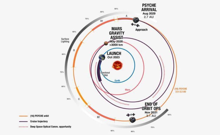 Μόλις το διαστημόπλοιο φτάσει στην Ψυχή, στην κύρια ζώνη αστεροειδών μεταξύ Άρη και Δία, θα περάσει περίπου 26 μήνες σε τροχιά γύρω από τον αστεροειδή, συλλέγοντας εικόνες και άλλα δεδομένα που θα πουν στους επιστήμονες περισσότερα για την ιστορία του και από τι αποτελείται.