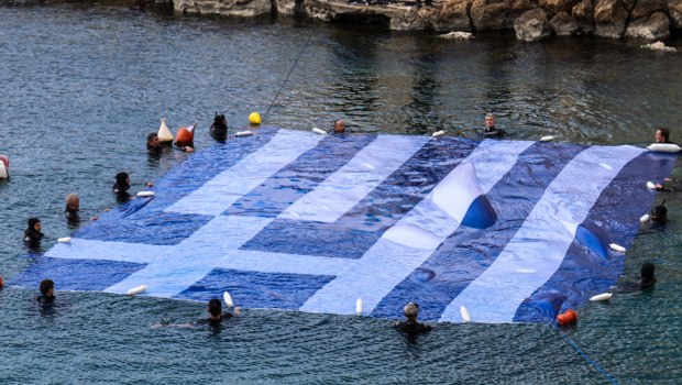 Το μεσημέρι της Κυριακής (22/3), στον Όρμο της Αφροδίτης (το γνωστό «Μπαϊκούτσι»), μέλη του Συνδέσμου Ελλήνων Βατραχανθρώπων βούτηξαν στα νερά για να απλώσουν μια τεράστια ελληνική σημαία στην επιφάνεια της θάλασσας.