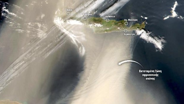 Η πρώτη δορυφορική εικόνα, από τον δορυφόρο Suomi NPP της NASA/NOAA και τον αισθητήρα VIIRS, αποτυπώνει σε περιφερειακή κλίμακα την εκτεταμένη ζώνη αφρικανικής σκόνης που μεταφέρεται προς την Κρήτη.