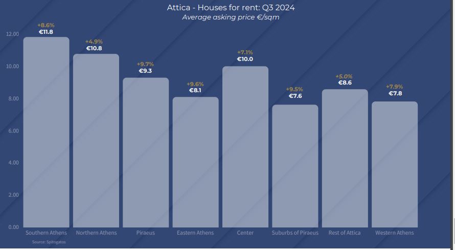 Στον τομέα των ενοικίων, οι κεντρικές και νότιες συνοικίες της Αθήνας συνεχίζουν να καταγράφουν υψηλές τιμές, με τις νότιες περιοχές να σημειώνουν μέση τιμή 11,8 ευρώ/τ.μ. το μήνα, ενισχυμένες κατά 8,6% σε ετήσια βάση.