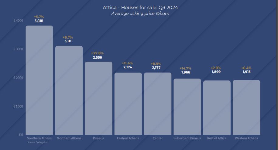 Ο Πειραιάς και τα προάστιά του κατέγραψαν τις πιο μεγάλες αυξήσεις στις τιμές πώλησης, φτάνοντας το 27,8% και 14,7% αντίστοιχα, ενώ οι νότιες περιοχές της Αθήνας παρέμειναν στην κορυφή της αγοράς με μέση τιμή πώλησης €3.818 ανά τ.μ.