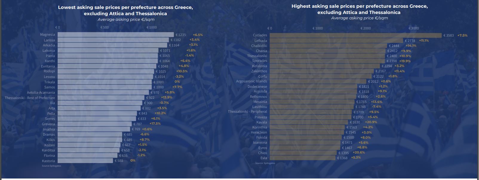 Πάνω από 1.800 ευρώ/τ.μ. κινούνται οι τιμές σε Δωδεκάνησα, Αργολίδα, Ρέθυμνο. Πάνω από 1.500 ευρώ/τ.μ. σε Μεσσηνία, Λασίθι, προάστια Θεσσαλονίκης, Πρέβεζα, Καβάλα (+20,9%), Κορινθία, Ηράκλειο, Φωκίδα, ενώ σε πάνω από 1.360 ευρώ/τ.μ. σε Ιωάννινα, Εβρο, Χίο (+20%), Εύβοια.