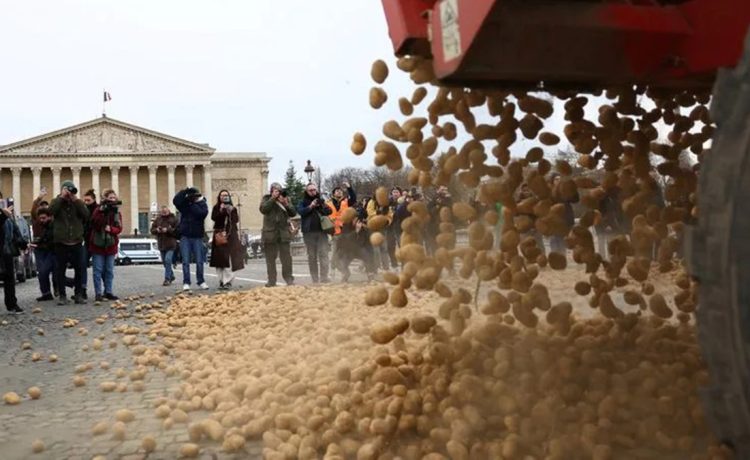 Από νωρίς το πρωί, περίπου 350 τρακτέρ κατευθύνθηκαν προς το κέντρο της γαλλικής πρωτεύουσας και έφτασαν μέχρι σημεία όπως η Αψίδα του Θριάμβου και το Pont de la Concorde, κοντά στην Εθνοσυνέλευση, όπου οι αγρότες επέλεξαν να αδειάσουν τουλάχιστον 30 τόνους πατάτες, ως συμβολική πράξη διαμαρτυρίας κατά των όρων της συμφωνίας που αποτελεί απειλή για τη βιωσιμότητα της γεωργίας.
