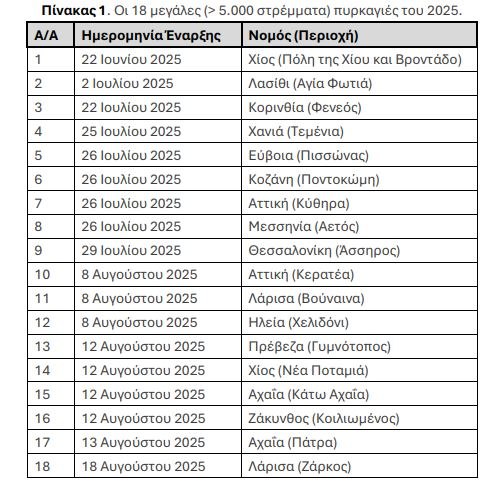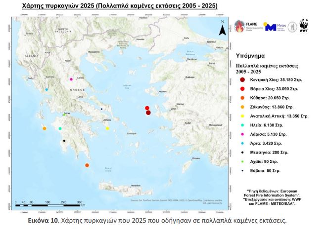 Και παρότι οι καμένες εκτάσεις της αντιπυρικής περιόδου του 2025 (478.280 στρέμματα) εμφανίζονται πολύ κοντά στον αντίστοιχο μέσο όρο της περιόδου 2006 – 2024 (497.380 στρέμματα), ο αριθμός των χαρτογραφημένων από το EFFIS πυρκαγιών (75) της αντιπυρικής περιόδου του 2025, εμφανίζεται αυξημένος κατά περίπου 39% σε σύγκριση με τον αντίστοιχο μέσο όρο της περιόδου 2006 – 2024.