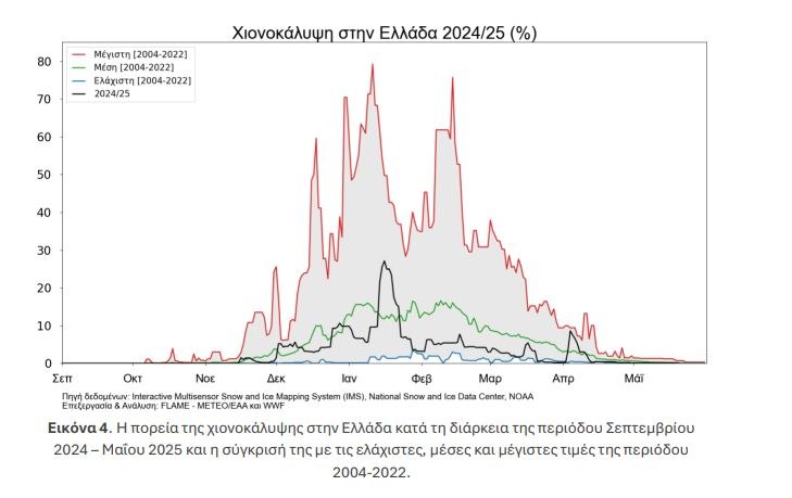Η ανάλυση δορυφορικών δεδομένων για την περίοδο Σεπτέμβριος 2024 – Μάϊος 2025 υποδεικνύει σημαντική απουσία χιονοκάλυψης, κυρίως από το τέλος του Ιανουαρίου 2025 και έπειτα.  Αξιοσημείωτο είναι το γεγονός ότι πέρα από μια πρόσκαιρη περίοδο στο πρώτο δεκαήμερο του Απριλίου (λιγότερες από 5 ημέρες), η χιονοκάλυψη ήδη από τα τέλη Ιανουαρίου ήταν σε πολύ χαμηλά επίπεδα. Σημαντική συνεισφορά σε αυτή την πορεία της χιονοκάλυψης έπαιξαν οι πολύ υψηλότερες των φυσιολογικών για την εποχή θερμοκρασίες που επικράτησαν στη χώρα κυρίως τον Ιανουάριο και τον Μάρτιο του 2025, με αποτέλεσμα τη δημιουργία συνθηκών σχετικά έντονης ατμοσφαιρικής ξηρασίας στο σύνολο σχεδόν της χώρας.