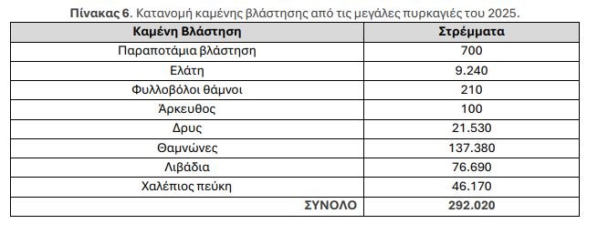 Η συνολική έκταση των περιοχών με δασική βλάστηση που κάηκε από τις μεγαλύτερες πυρκαγιές, ξεπέρασε τα 290.000 στρέμματα.