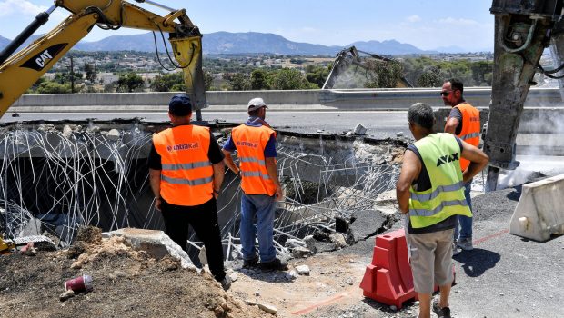 Σε πλήρη εξέλιξη είναι οι εργασίες κατεδάφισης της γέφυρας, στο ύψος του Ισθμού στο 75,5ο χιλιόμετρο της Εθνικής Οδού Αθηνών-Κορίνθου, όπου την Παρασκευή οι οδηγοί έζησαν μία κόλαση εκρήξεων και φωτιάς μετά την ανατροπή βυτιοφόρου, το οποίο στη συνέχεια παραδόθηκε στις φλόγες.
