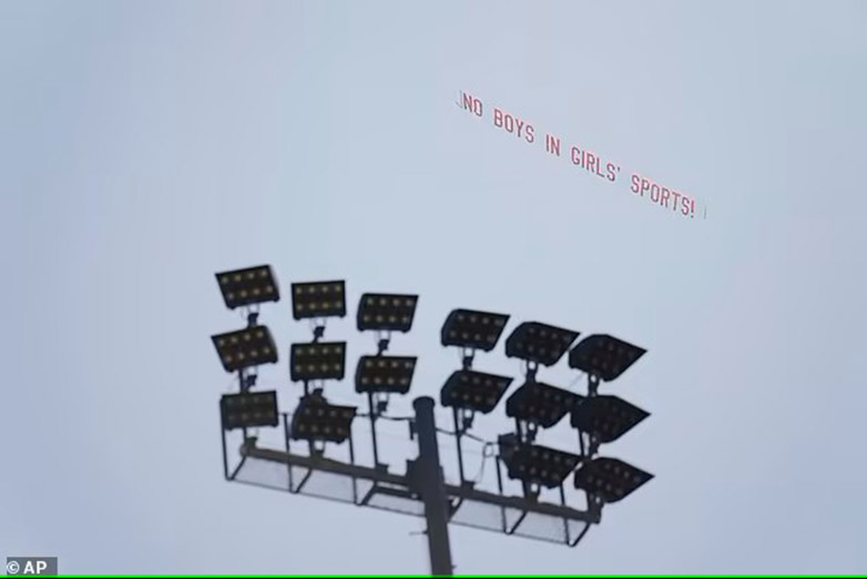 Η συγκεκριμένη αντιπαράθεση είχε πάρει τόσο μεγάλες και οργανωμένες διαστάσεις από υποστηρικτές της πολιτικής Τραμπ, όπου «επιστράτευσαν» ακόμη κι ένα μικρό αεροπλάνο, το οποίο πέταξε επάνω από τον αγωνιστικό χώρο, τη στιγμή που οι αθλήτριες εισέρχονταν σε αυτόν, τραβώντας ένα πανό που ανέγραφε: «όχι αγόρια σε αθλήματα κοριτσιών».