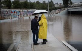 Δίπλα του και ελάχιστα πιο πίσω ένα λεωφορείο το οποίο αποφεύγει την τηλεόραση, όπως και έτερο όχημα που κινείτο πίσω από το αυτοκίνητο από όπου έπεσε η συσκευή.