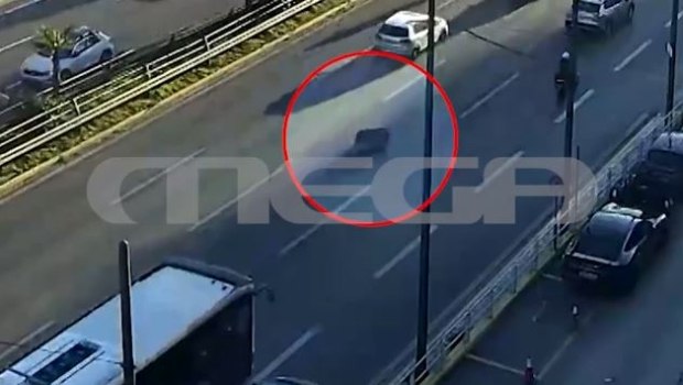 Όπως φαίνεται σε βίντεο του MEGA, η τηλεόραση «πετάει» από το αυτοκίνητο στο οδόστρωμα, την ώρα που το ΙΧ βρίσκεται στη μεσαία λωρίδα.
