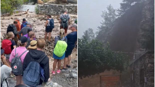 Στο δεύτερο βίντεο φαίνονται οι τουρίστες εγκλωβισμένοι σε ένα σημείο καθώς περνάνε από μπροστά τους τα ορμητικά νερά με φερτά υλικά.
