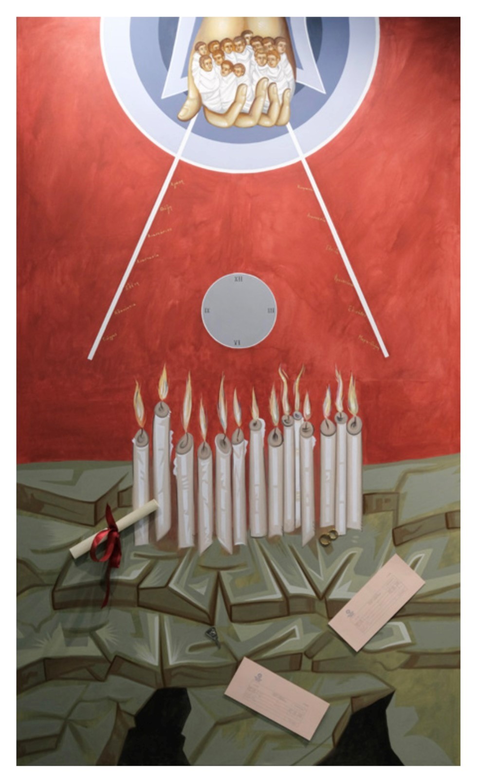 Ένα εισιτήριο τρένου με αναγραφόμενο προορισμό τη «Χώρα Ζώντων», δύο βέρες, ένα κλειδί, ένα ρολόι δίχως δείκτες – σύγχρονα αντικείμενα ενταγμένα σε ένα έργο βυζαντινής ζωγραφικής, σε έναν καμβά διαστάσεων 1,61×1 με ακρυλικά χρώματα, συνθέτουν μία εικόνα που εκπέμπει ένα μήνυμα παρηγορητικό και μία υπόσχεση μνήμης και προσευχής.