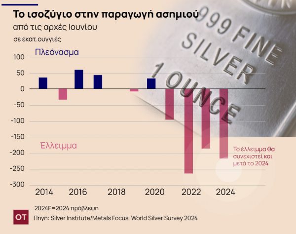 Τα ελλείμματα που καταγράφονται και αποτυπώνονται στην αγορά από το σχετικό γράφημα που παρουσιάζει σήμερα ο ΟΤ, αποδίδονται από τις ίδιες πηγές σε αυτή ακριβώς τη βιομηχανικής χρήσης που αναλογεί περίπου στο 50% της συνολικής και στην αναιμική –όπως χαρακτηρίζεται- εικόνα της προσφοράς. Το 2023 η παραγωγή υπολογίζεται ότι έφτασε τις 820 εκατ ουγγιές, αλλά η κατανάλωση διαμορφώθηκε σε 1,14 δισ ουγγιές όπως δείχνουν τα ίδια στοιχεία.