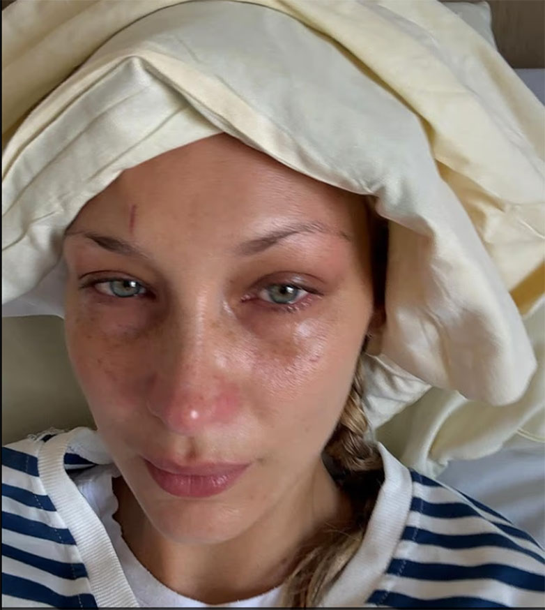 Σε μια άλλη φωτογραφία φαινόταν να κλαίει και στη συνέχεια εθεάθη με μια σακούλα πάγου στο μέτωπό της. Η 28χρονη Χαντίντ διαγνώστηκε με τη χρόνια ασθένεια το 2016.