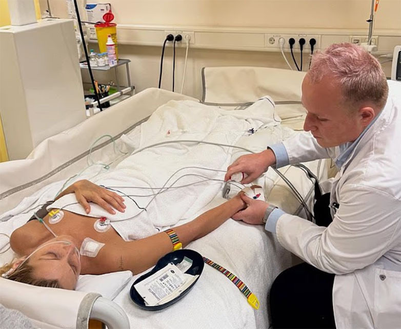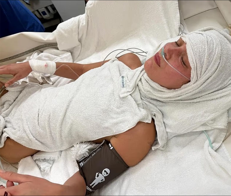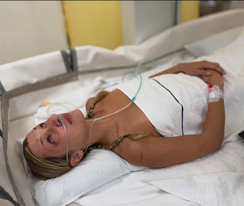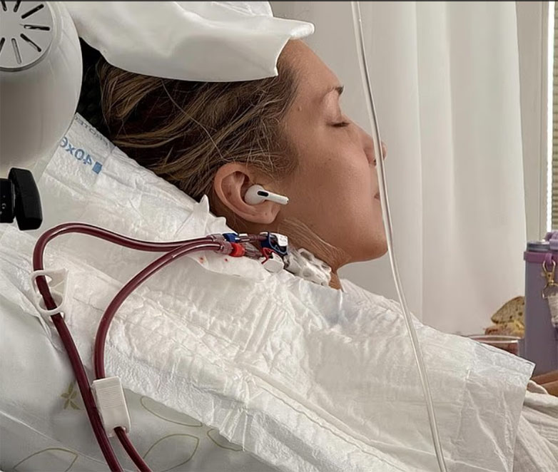 Μια εικόνα την έδειχνε με μια ενδοφλέβια ένεση προσαρτημένη στο λαιμό της με έναν σωλήνα στερεωμένο στα μαλλιά της πάνω από το κεφάλι της.