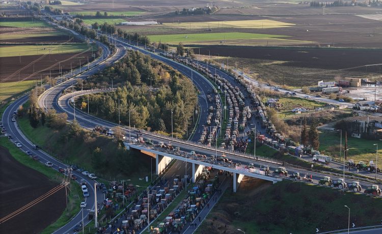 Υπολογίζεται ότι στο σημείο βρίσκονται περίπου 1.000 τρακτέρ, σε μια μεγάλη κινητοποίηση με τους αγρότες να έχουν στήσει πρόχειρα παραπήγματα και να δηλώνουν αποφασισμένοι να μείνουν εκεί έως ότου δοθούν λύσεις στα προβλήματά τους.