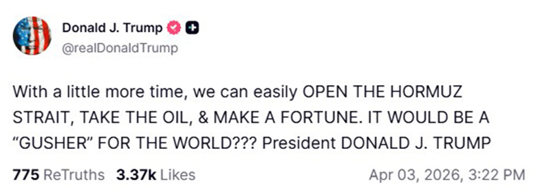 «Με λίγο περισσότερο χρόνο, μπορούμε εύκολα να ανοίξουμε τα Στενά του Ορμούζ, να πάρουμε το πετρέλαιο και να βγάλουμε μια περιουσία. Θα ήταν μια “πηγή πλούτου” για τον κόσμο;», γράφει χαρακτηριστικά ο Ντόναλντ Τραμπ.