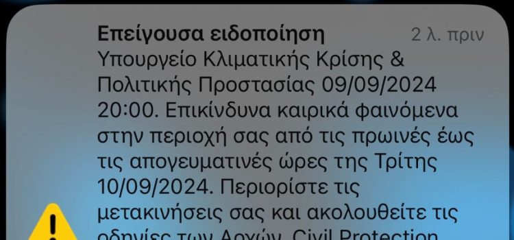 Μήνυμα από το 112 έλαβαν κάτοικοι της Λάρισας, ενόψει της κακοκαιρίας ΑΤΕΝΑ. Σύμφωνα με το μήνυμα αναμένονται επικίνδυνα καιρικά φαινόμενα στην περιοχή από τις πρωινές έως τις απογευματινές ώρες της Τρίτης 10/09/2024 20:00 «Περιορίστε τις μετακινήσεις σας και ακολουθηστε τις...