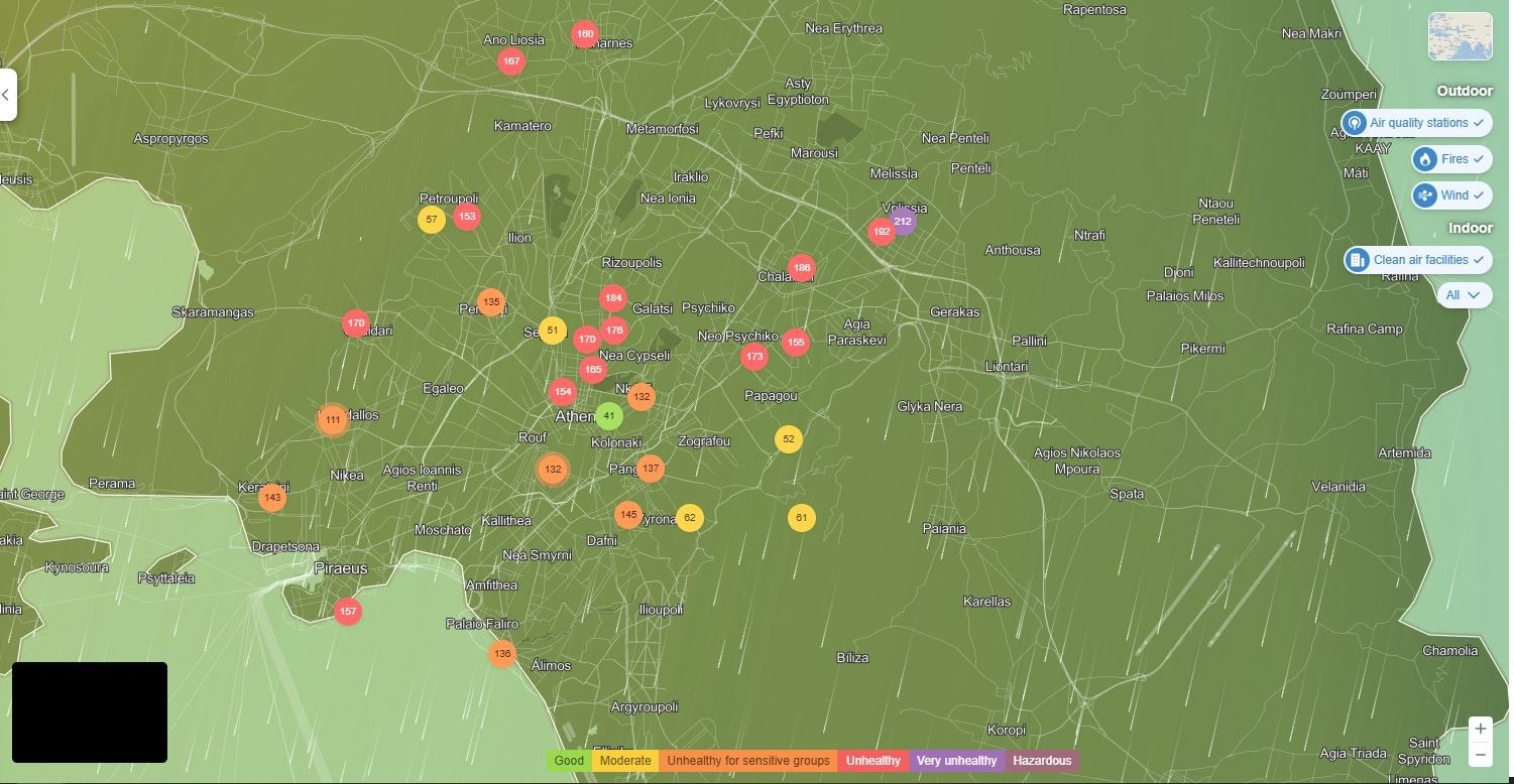 Ειδικές εφαρμογές για την ποιότητα του αέρα δείχνουν μεγάλη αύξηση της ατμοσφαιρικής μόλυνσης αυτή την στιγμή σε Βρυλίσσια, Ψυχικό, Παλαιό Ψυχικό, Χαλάνδρι, Πειραιά, Κάτω Πατήσια, Χαϊδάρι, Κυψέλη, Πετράλωνα και σε πολλές ακόμα περιοχές στο κέντρο της Αθήνας, σύμφωνα με την IQAir (δείτε εδώ live χάρτη) η οποία ειδικεύεται σε μετρήσεις της ποιότητας της ατμοσφαιρικής ρύπανσης.