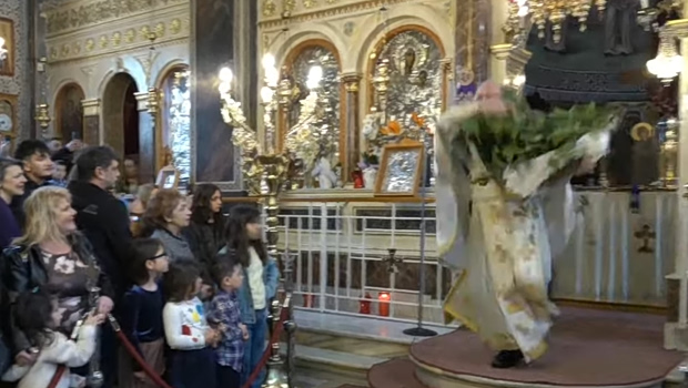 Ο π. Χριστόφορος Γουρλής πραγματοποίησε το καθιερωμένο του «σάλτο» από την Ωραία Πύλη, σκορπώντας δάφνες από το καλάθι συνοδεία χτυπημάτων στα στασίδια, ενώ οι καμπάνες χτυπούσαν χαρμόσυνα.