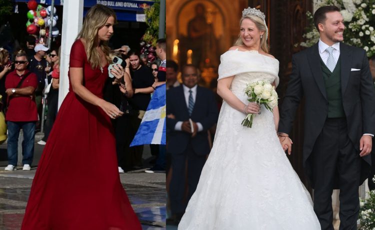 Για την περίσταση, προτίμησε ένα maxi φόρεμα σε υπέροχη κόκκινη απόχρωση, που κατέληγε σε αέρινη φούστα ενώ το πάνω μέρος είχε off shoulder σχέδιο και lace details. H Χρυσή Βαρδινογιάννη ολοκλήρωσε το outfit με έναν εντυπωσιακό σταυρό και minimal πέδιλα σε μαύρο χρώμα δημιουργώντας ένα elegant outfit ιδανικο για wedding quest.