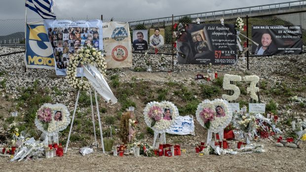 Πανώ και λουλούδια για τα θύματα στα Τέμπη