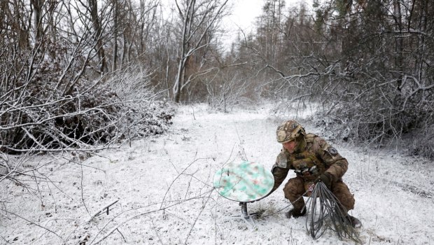 Ουκρανός στρατιώτης επιβλέπει τερματικό Starlink στην οροφή αυτοκινήτου στο Νοντέσκ στις 27 Φεβρουαρίου 2023 (Reuters)