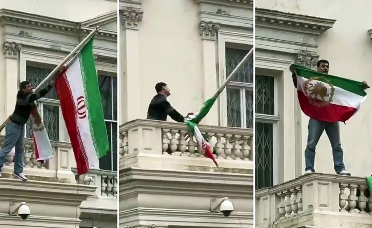 🚨BREAKING: The flag on Iran’s embassy in London has just been replaced with the lion and sun flag by a protester