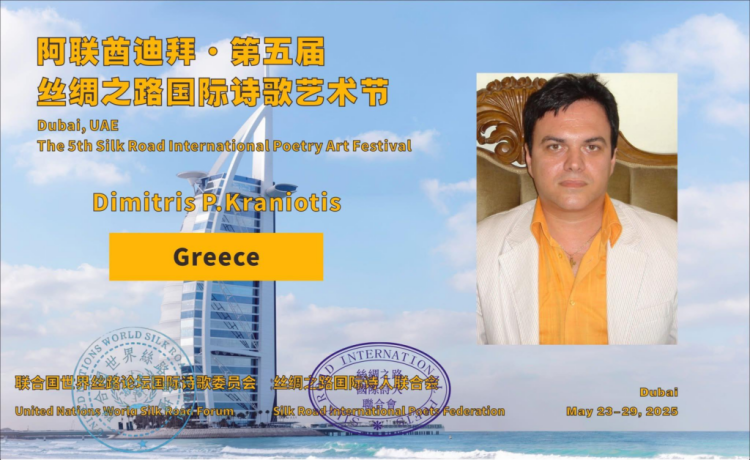 Νέα σημαντική διεθνής διάκριση για τον Λαρισαίο ποιητή Δημήτρη Π. Κρανιώτη, ο οποίοςτιμήθηκε στο Ντουμπάι με το διεθνές βραβείο ποίησης “European Poet of the Year Award” (Ευρωπαίος Ποιητής της Χρονιάς) για το 2025, στο πλαίσιο του 5ου Διεθνούς Φεστιβάλ Ποίησης “Silk Road International Poetry Art Festival”, που διοργανώθηκε στο Ντουμπάι των Ηνωμένων Αραβικών Εμιράτων, 23-29 Μαϊου 2025, από τους διεθνείς οργανισμούς “United Nations World Silk Road Forum” και “Silk Road International Poets Federation” της Κίνας.