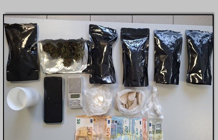 Οι αστυνομικοί, μετά από κατάλληλη αξιοποίηση στοιχείων για κατοχή και διακίνηση ποσοτήτων ναρκωτικών από τον συλληφθέντα, διενήργησαν έρευνα στο σπίτι του, όπου βρέθηκαν και κατασχέθηκαν 2 νάιλον συσκευασίες με ποσότητες ηρωίνης, συνολικού βάρους 135,5 γραμμαρίων, μία νάιλον συσκευασία με ποσότητα κοκαΐνης, βάρους 30 γραμμαρίων, 6 νάιλον συσκευασίες με ποσότητες ακατέργαστης κάνναβης, συνολικού βάρους 189 γραμμαρίων, ένα πλαστικό κουτί με βενζοκαΐνη, βάρους 137 γραμμαρίων, μία ζυγαριά, ένα κινητό τηλέφωνο και το χρηματικό ποσό των 795 ευρώ.
