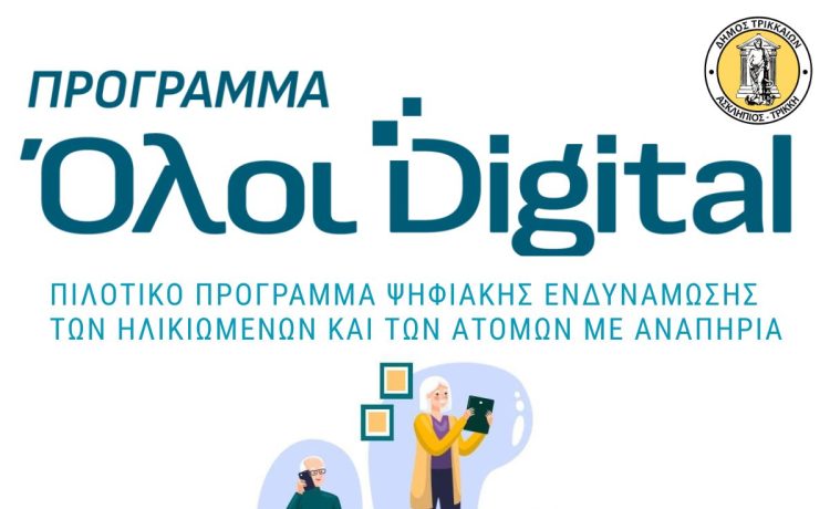 Τριάντα ηλικιωμένοι που διαβιούν στον Δήμο Τρικκαίων θα απεκτήσουν ψηφιακές δεξιότητες, μαθαίνοντας την… ψηφιακή αλφαβήτα. Πρόκειται για πρόγραμμα του Υπουργείου Κοινωνικής Συνοχής και Οικογένειας με τίτλο «Ολοι Digital», για την ψηφιακή εκπαίδευση και ενδυνάμωση ηλικιωμένων και ατόμων με αναπηρία. Το Πρόγραμμα υλοποιείται με πόρους του Ταμείου Ανάκαμψης (έργο «Ψηφιακή εκπαίδευση και ενδυνάμωση των ηλικιωμένων και των ατόμων με αναπηρία») στο πλαίσιο της συνεργασίας των Υπουργείων Κοινωνικής Συνοχής και Οικογένειας και Ψηφιακής Διακυβέρνησης, με φορείς υλοποίησης το ΙΝ.Ε.Σ.ΑμεΑ και την Ε.Δ.Υ.Τ.Ε. Α.Ε. Το σκέλος του προγράμματος που υλοποιεί ο Δήμος Τρικκαίων αφορά σε 30 ηλικιωμένους, (από το 65ο έτος της ηλικίας και άνω), υλοποιείται στον χώρο του Ε΄ ΚΑΠΗ του Δ. Τρικκαίων, σε 2 τμήματα των 15 ατόμων για συνολικά 70 ώρες μαθημάτων.