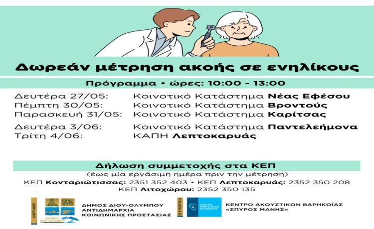 Ο Δήμος Δίου-Ολύμπου παρέχει δωρεάν μέτρηση ακοής σε όποιον ενήλικο ενδιαφέρεται το διάστημα 13 Μαΐου έως και 4 Ιουνίου, σύμφωνα με το ακόλουθο πρόγραμμα: