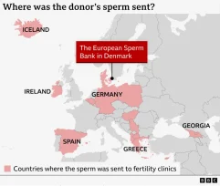 Όπως θα δείτε και στον παρακάτω χάρτη, αν και ο δότης ζούσε στη Δανία, το σπέρμα του δόθηκε σε πολλές γυναίκες από διαφορετικές χώρες μεταξύ των οποίων και η Ελλάδα, κάτι που έχει προκαλέσει ιδιαίτερη ανησυχία. Το μολυσμένο σπέρμα του πουλήθηκε σε κλινικές εξωσωματικής γονιμοποίησης στην Ισλανδία, την Ιρλανδία, τη Γερμανία, την Ισπανία, τη Γεωργία και στη χώρα μας, όπως προαναφέρθηκε.