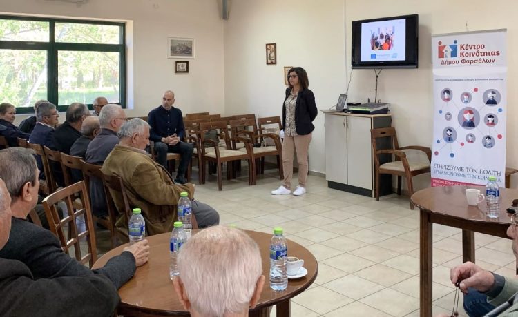 Με επιτυχία πραγματοποιήθηκε την Τετάρτη 10 Απριλίου η δράση ευαισθητοποίησης του Κέντρου Κοινότητας δήμου Φαρσάλων στο Κέντρο Ανοιχτής Προστασίας Ηλικιωμένων (ΚΑΠΗ) του δήμου. Πιο συγκεκριμένα, η κοινωνική λειτουργός του Κέντρου Κοινότητας, Παρασκευή Μπακαρού, ανέπτυξε το θέμα: «Η συμμετοχή και η προσφορά της Τρίτης Ηλικίας στην σύγχρονη κοινωνία». Μέσα από ανοιχτή συζήτηση οι παρευρισκόμενοι είχαν την ευκαιρία να ανταλλάξουν απόψεις, να προβληματιστούν γύρω από το θέμα και να αλληλεπιδράσουν, καταλήγοντας πως η κοινωνική συμμετοχή και προσφορά των ατόμων της τρίτης ηλικίας αποτελεί ασπίδα προστασίας για τα ίδια τα άτομα.