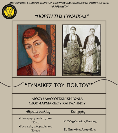 Ο Μορφωτικός Σύλλογος Ποντίων Φοιτητών και Σπουδαστών νομού Λάρισας “Το Ροδάφνον” και η αντιδημαρχία Πολιτισμού Δήμου Λαρισαίων, τιμώντας την Ημέρα της Γυναίκας, διοργανώνουν ημερίδα με θέμα “Γυναίκες του Πόντου”, την Παρασκευή 8 Μαρτίου στις 7 το απόγευμα, στην Λογοτεχνική Γωνιά (Φαρμακίδου και Γαληνού)