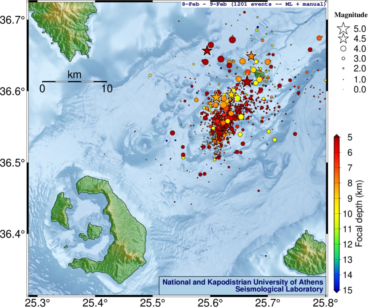 Χάρτης κατανομής σεισμών στην περιοχή των Κυκλάδων (Σαντορίνη-Αμοργός-Ίος) που καταγράφηκαν στις 8 Φεβρουαρίου (ανάλυση με τεχνητή νοημοσύνη) και στις 9 Φεβρουαρίου (καθημερινή ανάλυση). Η ακτίνα των κύκλων είναι ανάλογη του μεγέθους του σεισμού (υπόμνημα επάνω-δεξιά), ενώ τα επίκεντρα σεισμών με μεγέθη μεγαλύτερα ή ίσα του 4.5 σημειώνονται με αστέρι. Ο χρωματισμός ανταποκρίνεται στο εστιακό βάθος, σύμφωνα με τη χρωματική κλίμακα (δεξιά).