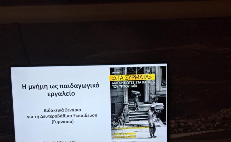 Με ιδιαίτερη επιτυχία πραγματοποιήθηκε το Σάββατο 8 Νοεμβρίου στο Μουσείο Πόλης του Βόλου η ημερίδα παρουσίασης των εκπαιδευτικών προγραμμάτων που σχεδιάστηκαν στο πλαίσιο της περιοδικής έκθεσης «Στα Σύρματα: Μαγνησιώτες στα κάτεργα του Τρίτου Ράιχ», Στην έκθεση παρουσιάζονται ιστορίες Μαγνησιωτών που εκτοπίστηκαν για καταναγκαστική εργασία σε στρατόπεδα του Τρίτου Ράιχ, μια πτυχή της ευρωπαϊκής ιστορίας που έως πρόσφατα παρέμενε άγνωστη.